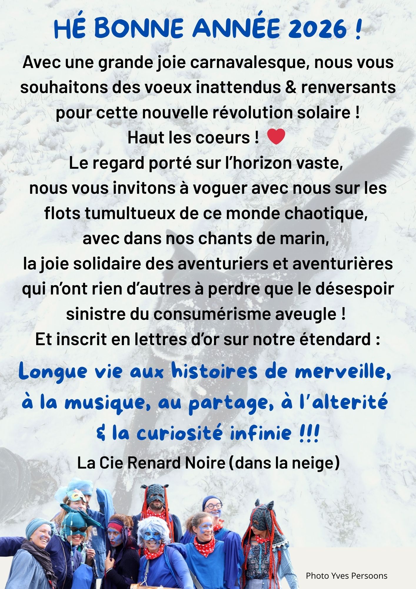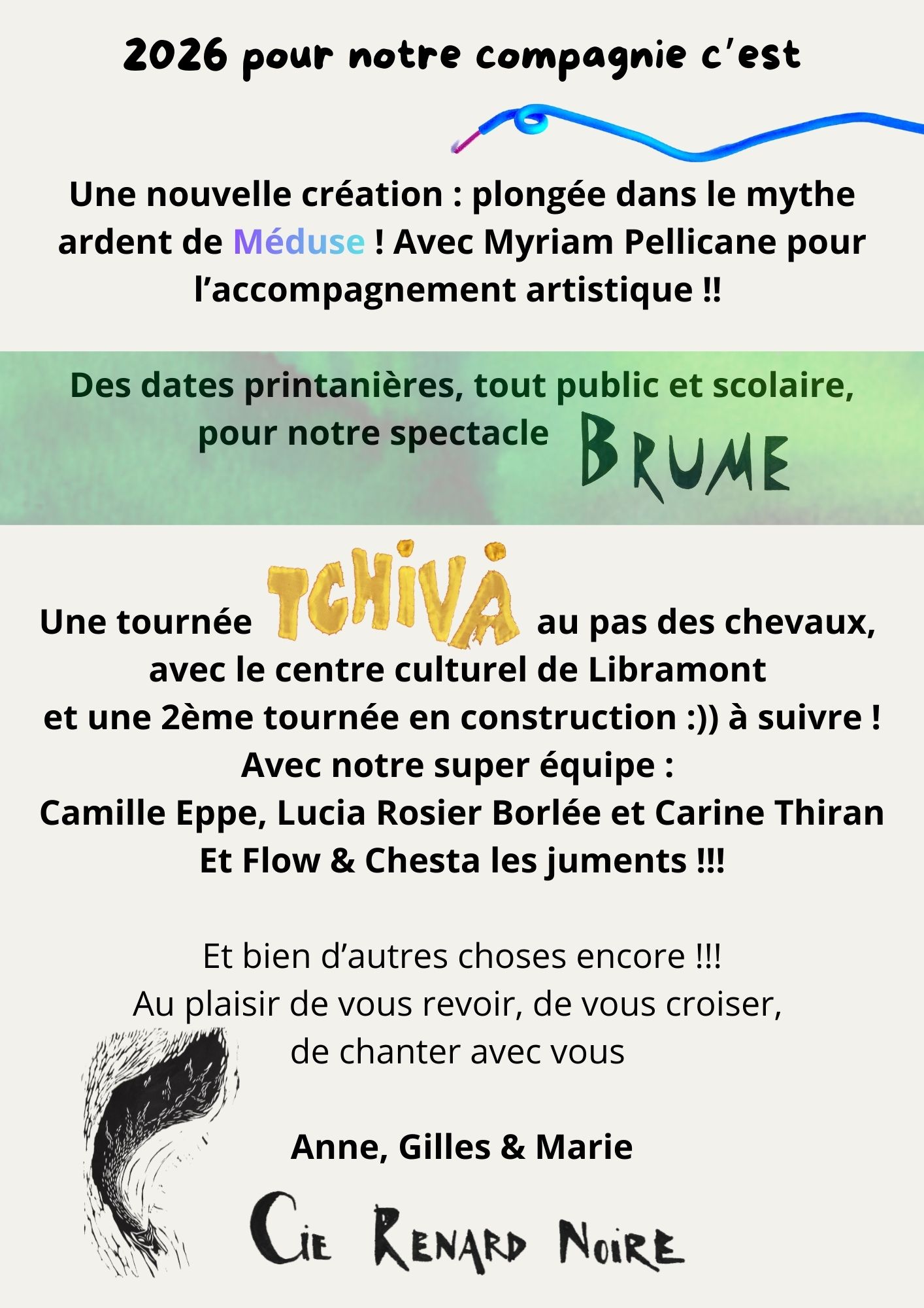 La Cie Renard Noire existe depuis 2018. Les 2 artistes travaillent ensemble depuis 2011. La Cie est implantée dans le village rural famennois de Buissonville. Ses activités actuelles sont :